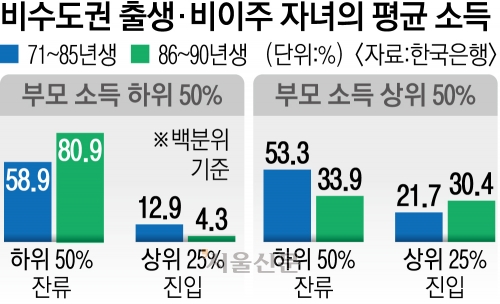 특히 지방에서 태어나 고향에 남은 자녀들은 ‘가난의 대물림’이 더욱 심화하고 있다. 지방에서 태어나 고향에 머문 부모소득 하위 50%의 자녀가 여전히 하위 50%에 머무는 비율은 과거(71~85년생) 58.9%에서 최근(86~90년생) 80.9%로 급등했다. 이들 중 소득 상위 25%로 진입한 비율은 같은 기간 12.9%에서 4.3%로 급감했다. 아울러 부모 자산이 하위 25%에 속한 자녀는 부모 자산이 상위 25%인 자녀보다 수도권으로 이주할 확률이 43% 포인트나 낮았다. 정민수 한은 조사국 지역경제조사팀장은 “비수도권 거점대학이 소수의 분야라도 상위권 대학 수준의 경쟁력을 갖추도록 선택과 집중 전략이 필요하다”며 “장기적으로 비수도권 내 세대 간 대물림을 완화할 수 있도록 산업과 일자리 기반을 개선하는 것이 중요하다”고 말했다.