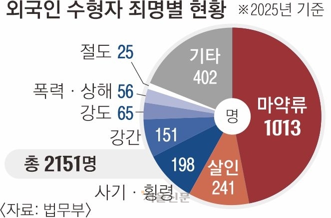 외국인 수형자가 늘어난 가장 큰 원인으로는 마약 범죄의 급증이 꼽힌다. 외국인 수형자 2151명 중 ‘마약류’ 사범은 1013명으로 전체의 47.1%를 차지했다. 살인(241명), 사기·횡령(198명), 강간(151명) 등 주요 강력 범죄를 모두 합친 것보다 많은 수치다.