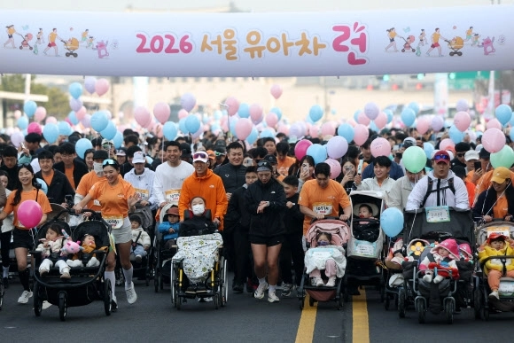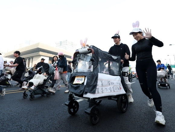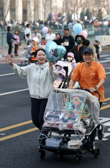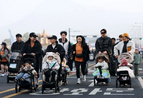 저출생 극복 메시지를 담아 가족이 함께 걷고 뛰는 ‘서울 유아차 런’이 28일 서울 종로구 광화문광장에서 개최됐다.