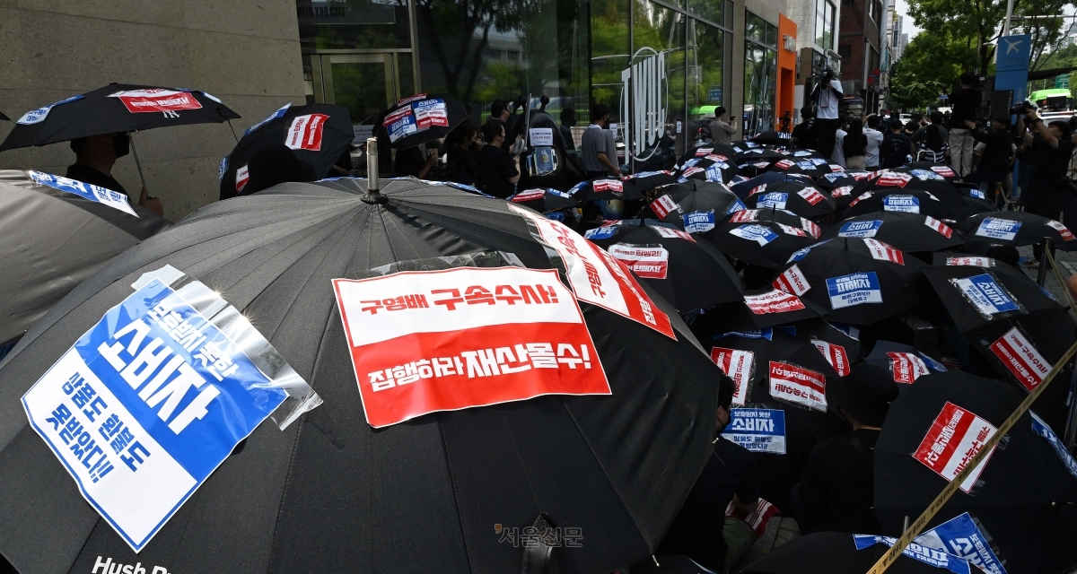 13일 서울 강남구 티몬 사옥 앞에서 티메프·큐텐 사태 피해 판매자 및 피해자 연합 회원들이 구영배 큐텐 대표 구속과 판매대금 환불을 촉구하고 있다.