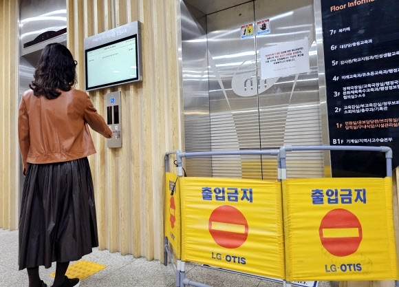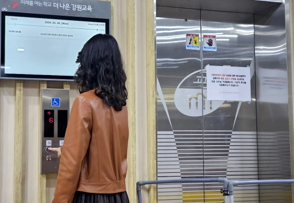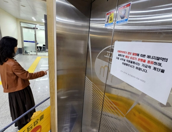 30일 강원 춘천시 강원특별자치도교육청이 에너지 절약에 동참하고자 승강기 2대 중 1대의 운행을 정지하고 있다.