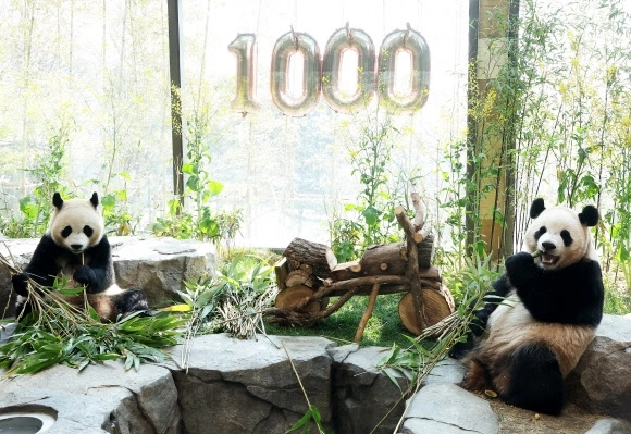 쌍둥이 판다들은 주키퍼들이 준비한 특식인 대나무 김밥을 먹고 나무로 만든 오토바이 장난감을 가지고 놀며 즐거운 1000일 기념일을 보냈다.