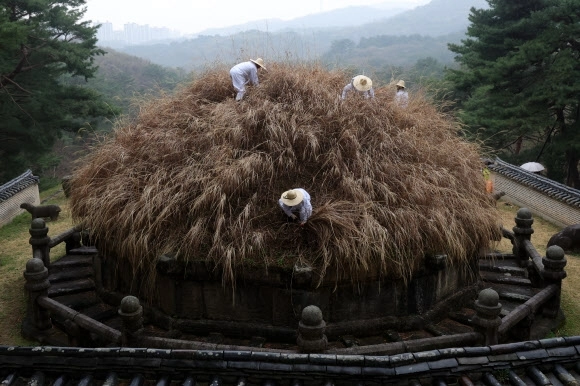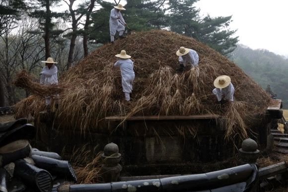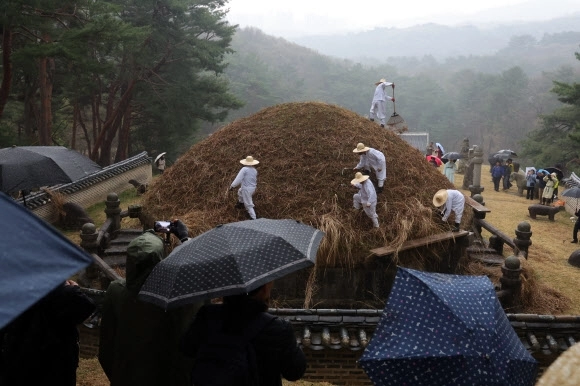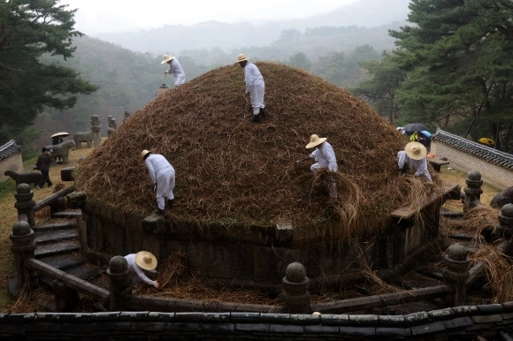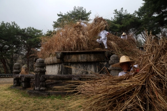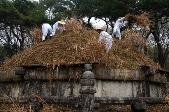 한식인 6일 오전 경기도 구리시 동구릉에서 열린 건원릉 청완 예초의에서 동구릉 관리사무소 관계자들이 봉분 억새를 자르고 있다.