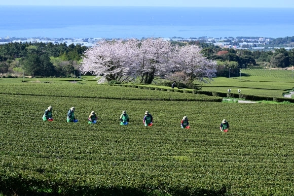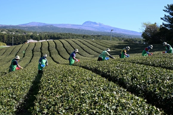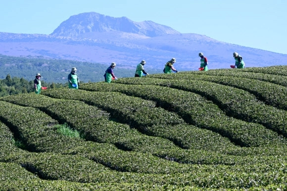 화창한 날씨를 보인 8일 오전 제주 서귀포시 도순동 돌송이차밭에서 농민들이 해차를 수확하고 있다. 해차는 그해에 새로 나는 차를 이르는 말이다.