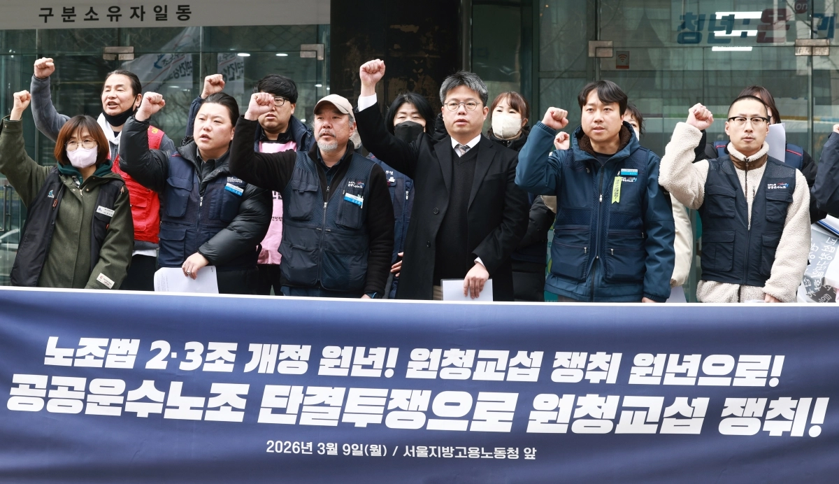지난달 9일 노란봉투법 시행을 하루 앞두고 서울 종로구 서울고용노동청 앞에서 열린 공공운수노조 원청교섭 투쟁선포 기자회견에서 참석자들이 구호를 외치고 있다. 연합뉴스