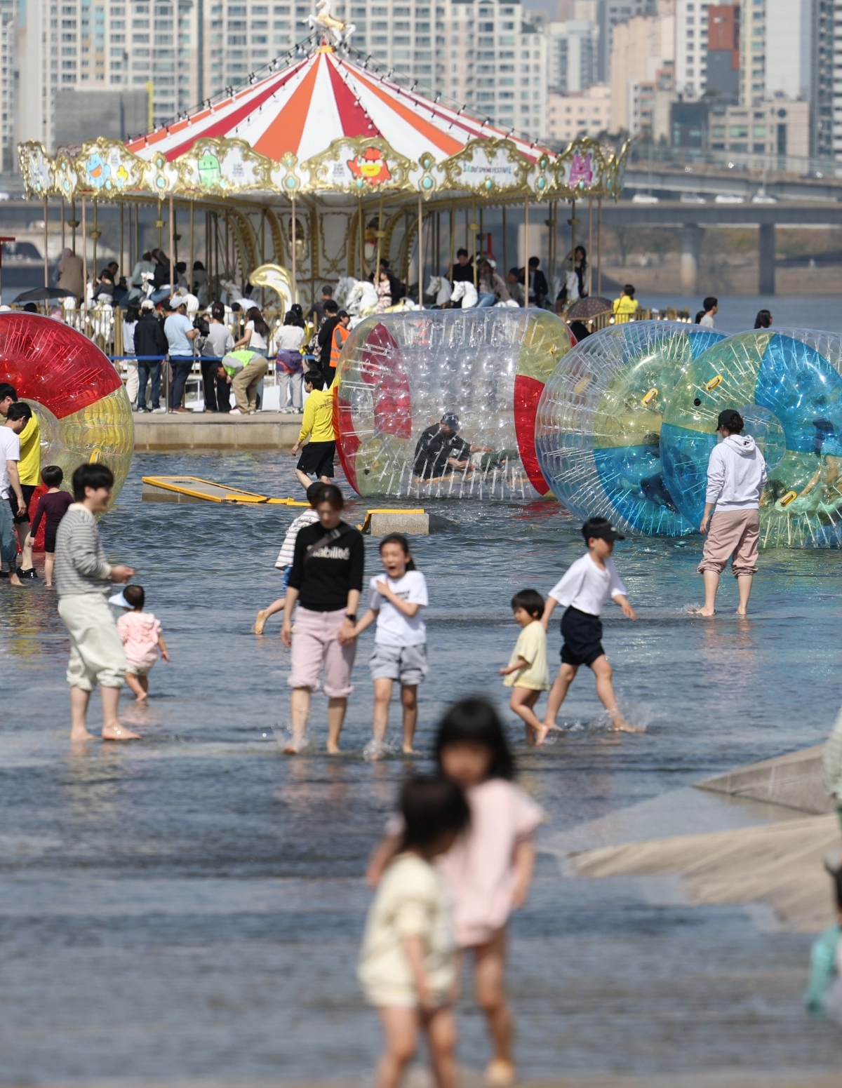 낮 최고기온이 영상 23도까지 올라간 12일 서울 여의도 한강공원 물놀이장에서 어린이들이 더위를 식히고 있다. 기상청에 따르면 13일은 전국 내륙을 중심으로 낮 기온이 영상 25도 이상으로 크게 오르며 평년을 웃도는 초여름 날씨가 이어질 전망이다. 일교차는 15도 안팎으로 벌어져 환절기 건강 관리에 유의가 필요하다.