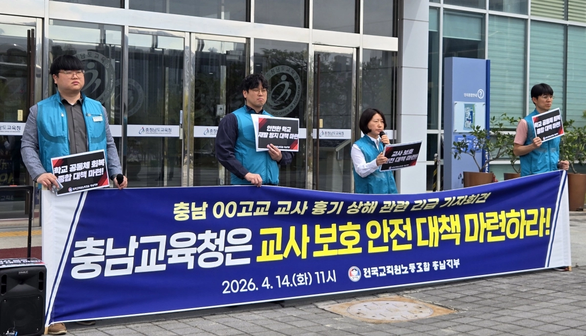 전국교직원노동조합 충남지부 관계자들이 14일 오전 충남 홍성 충남도교육청 앞에서 계룡 교사 흉기 사건과 관련한 기자회견을 하고 있다. 2026.4.14
