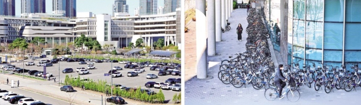 공공기관 차량 2부제(홀짝제) 및 공영주차장 5부제가 실시된 8일 평소 꽉 차던 정부세종청사 옥외 주차장이 한산해졌다(왼쪽 사진). 오른쪽 사진은 차량 대신 세종시 공공자전거 ‘어울링’을 타고 출근한 공무원이 늘면서 청사 주변에 세워둔 자전거가 평소보다 2배가량 많아진 모습.