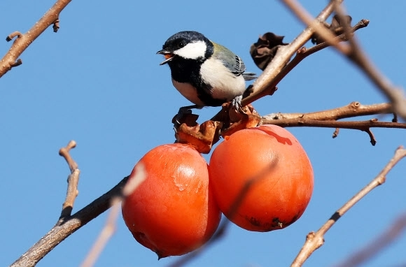 사진은 21일 경기도 수원시 한 공원에서 박새가 까치밥으로 남겨놓은 감을 먹고 있다.