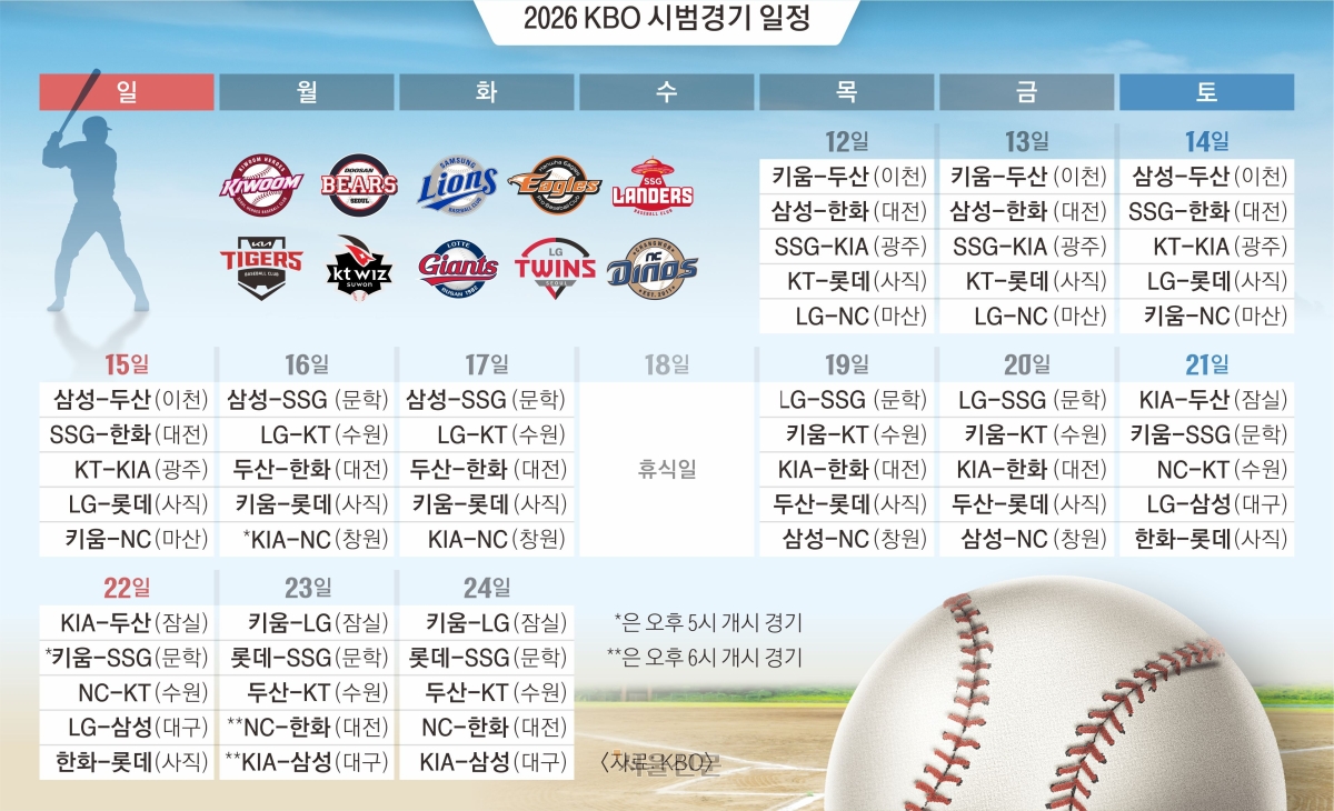 한국 야구가 17년 만에 월드베이스볼클래식(WBC) 8강에 진출한 가운데, KBO리그가 시범경기로 야구 열기를 이어간다. 2026 KBO리그 시범경기는 12일 시작해 24일까지 팀당 12경기, 모두 60경기 일정을 소화한다.